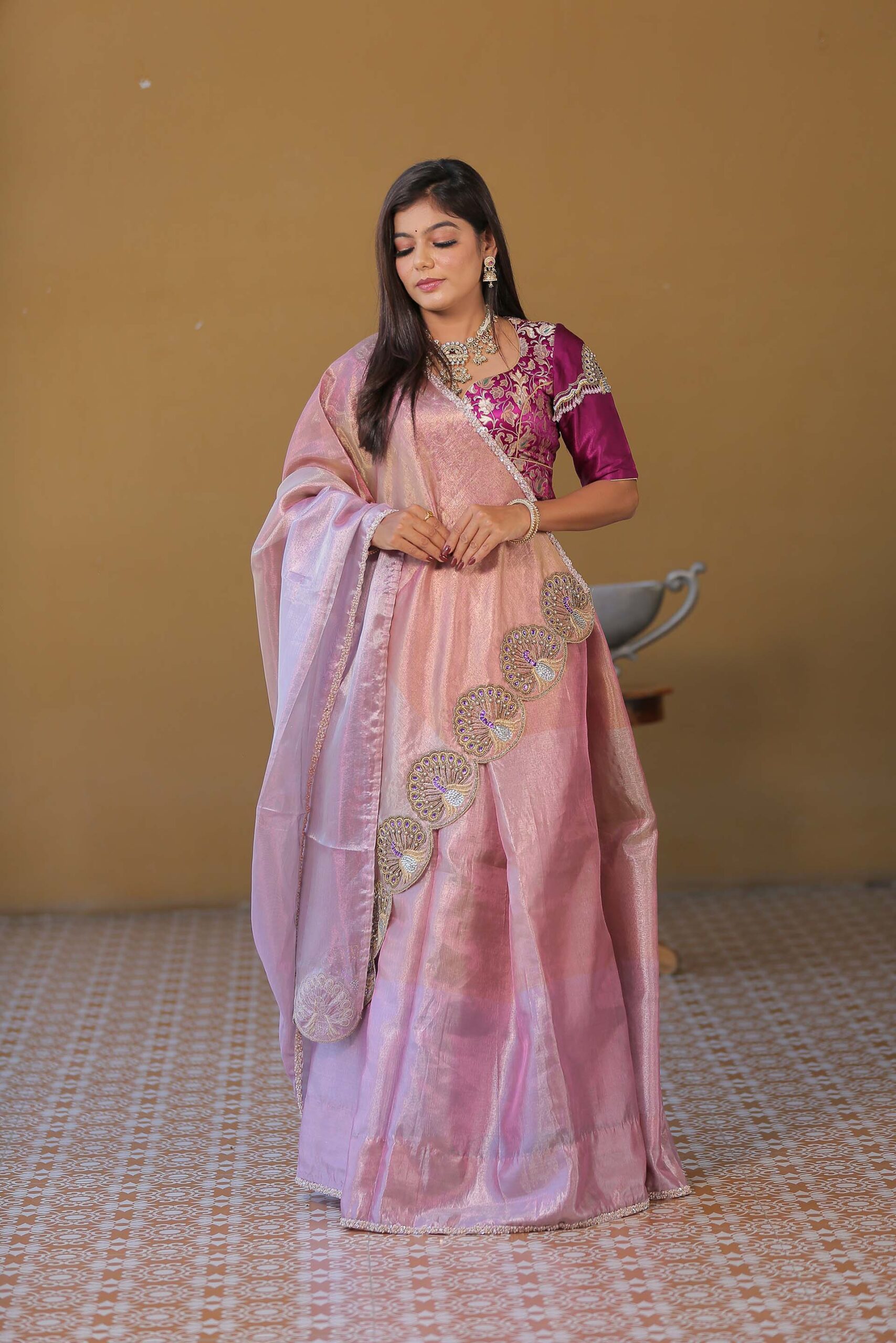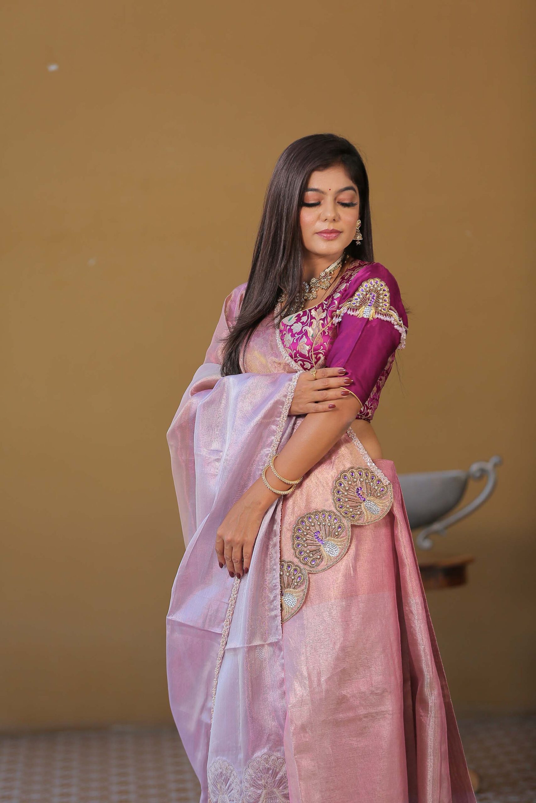 / Pink Tissue Silk Saree With Banarsi Blouse